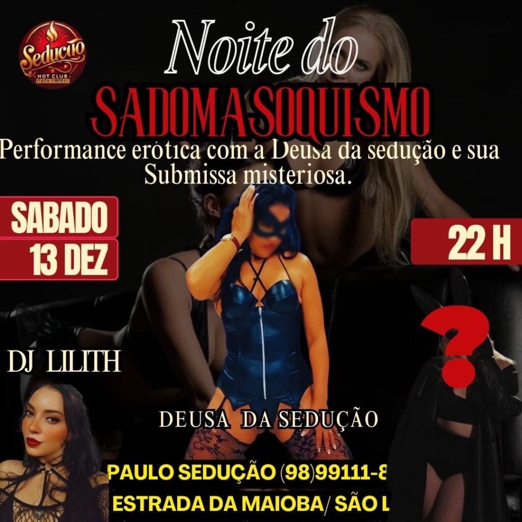 No dia 13/12, a casa vira território da Deusa da Sedução, aquela que domina o ambiente só de aparecer. Ao lado dela, a submissa misteriosa, pronta pra deixar a noite ainda mais intensa e cheia de provocação.